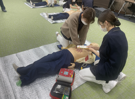 マネキンを用いて、心肺蘇生法やAEDの使用方法についての手技を実践的に行いました。
