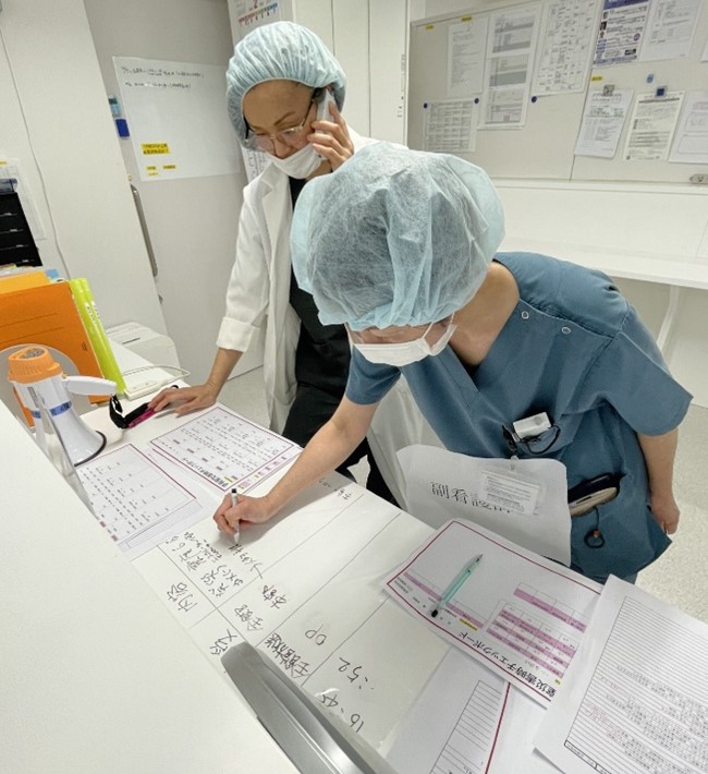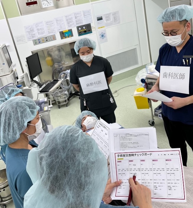 手術室では、患者1名が抜管後という状況を設定し、歯科医師・麻酔科医師・看護師が責任者の指示のもと、連携しながら対応しました。4階エリアに重点を置いた訓練は、今回が初めての試みであったこともあり、訓練を通しての課題を見つけることができました。今後、手術室をはじめとした対策やマニュアルの見直しに活かしていきます。
